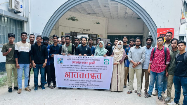 শনিবার (২৯ নভেম্বর) সকাল ১০টায় বিশ্ববিদ্যালয়ের মীর মশাররফ হোসেন একাডেমিক ভবনের নিচে মানববন্ধন করেন আইন অনুষদের শিক্ষার্থীরা।