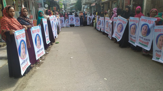 মানববন্ধনে নিহতের মা সমলা বেগম বলেন, আমি আমার মাইয়ার হত্যার বিচার চাই,ফাঁসি চাই,আমার মাইয়ারে যে মারছে আল্লাহ তুমি তার বিচার কইরো।