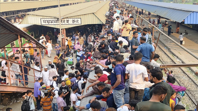 শনিবার (৫ এপ্রিল) বিকেলে ময়মনসিংহ রেলওয়ে স্টেশন এলাকায় দেখা গেছে ঢাকামুখী কর্মজীবীদের এই জনস্রোত।