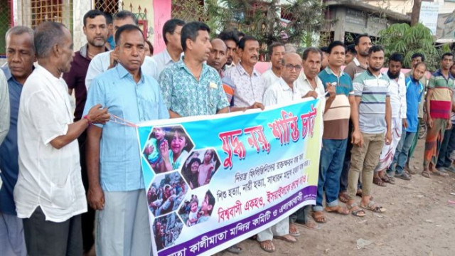 শুক্রবার জেলার কালিগঞ্জ উপজেলার নলতা হাটখোলায় কালীমাতা মন্দির কমিটির ও এলাকাবাসীর আয়োজনে ‘যুদ্ধ নয়, শান্তি চাই, নিরস্ত্র ফিলিস্তিনিদের রক্তক্ষরণ বন্ধ কর, শিশু হত্যা, নারী হত্যা, সাধারণ মানুষ হত্যা বন্ধ কর, বিশ্ববাসী এক হও, ইসরাইলকে রুখে দাও’ এই শ্লোগানকে সামনে রেখে উক্ত প্রতিবাদী মানববন্ধন সমাবেশ অনুষ্ঠিত হয়েছে।