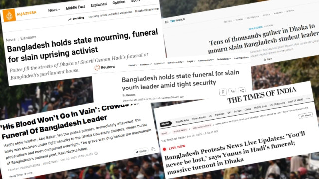 বার্তা সংস্থা রয়টার্স লিখেছে, বাংলাদেশের অন্তর্বর্তী সরকার প্রধান অধ্যাপক মুহাম্মদ ইউনূসসহ লাখো মানুষ আজ প্রয়াত যুবনেতা ওসমান হাদির জানাজায় অংশ নিয়েছে। জাতীয় কবি কাজী নজরুল ইসলামের সমাধির পাশে হাদিকে দাফন করার মাধ্যমে বাংলাদেশের সাম্প্রতিক ইতিহাসে তার বীরত্বসূচক ভূমিকাকে সম্মান জানানোর কথাও উল্লেখ করেছে তারা।
