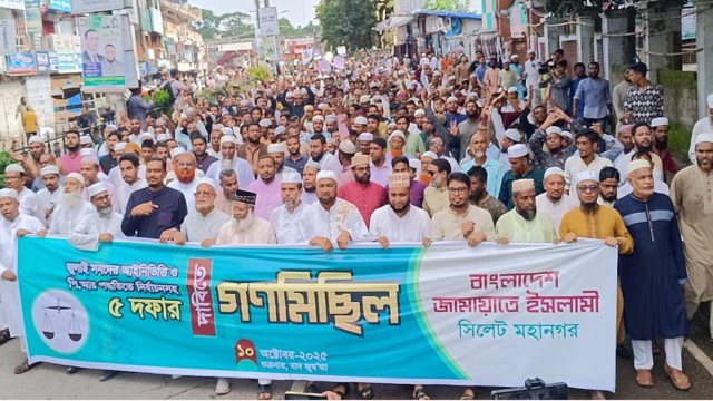শুক্রবার (১০ অক্টোবর) বাদ জুমআ নগরীর কোর্টপয়েন্টে অনুষ্ঠিত সমাবেশে তিনি এসব কথা বলেন। পরে সেখানে থেকে একটি বিশাল গণমিছিল নগরীর গুরুত্বপূর্ণ পয়েন্ট প্রদক্ষিণ করে চৌহাট্টা পয়েন্টে শেষ হয়। মিছিলে সিলেট মহানগর ও বিভিন্ন থানা, ওয়ার্ড ও ইউনিটের হাজারো জনশক্তি অংশ নেন।